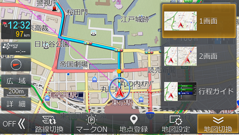 [1画面][2画面][行程ガイド]のいずれかにタッチすると、選んだ地図表示に切りかわります。