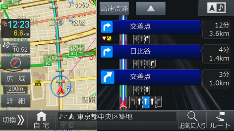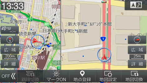 画面を左右に分割します。左右の画面に別の縮尺や方位を指定できるため、縮尺を変更して詳細スケールと広域スケールの2画面を表示させたり、3D市街地図とノースアップ地図とを組み合わせたりできます。