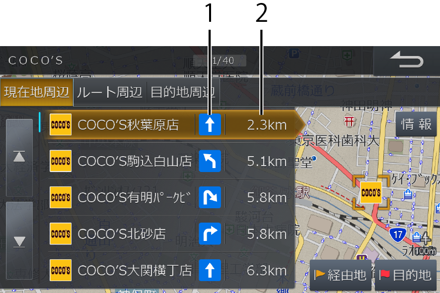 [ルート周辺]または[目的地周辺]にタッチして、それぞれの周辺の施設リストに切りかえることができます。