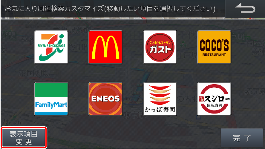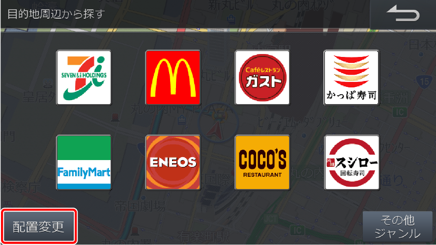 周辺検索画面に表示されるブランドのアイコン位置を入れかえることができます。また、表示させるアイコンをリストから選ぶことができます。