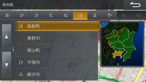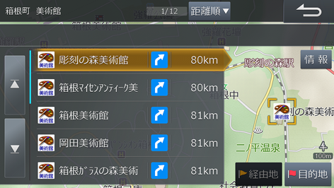 施設リスト表示時に、画面右側地図上の[目的地][経由地]にタッチすると、選択している施設を目的地・経由地に設定できます。