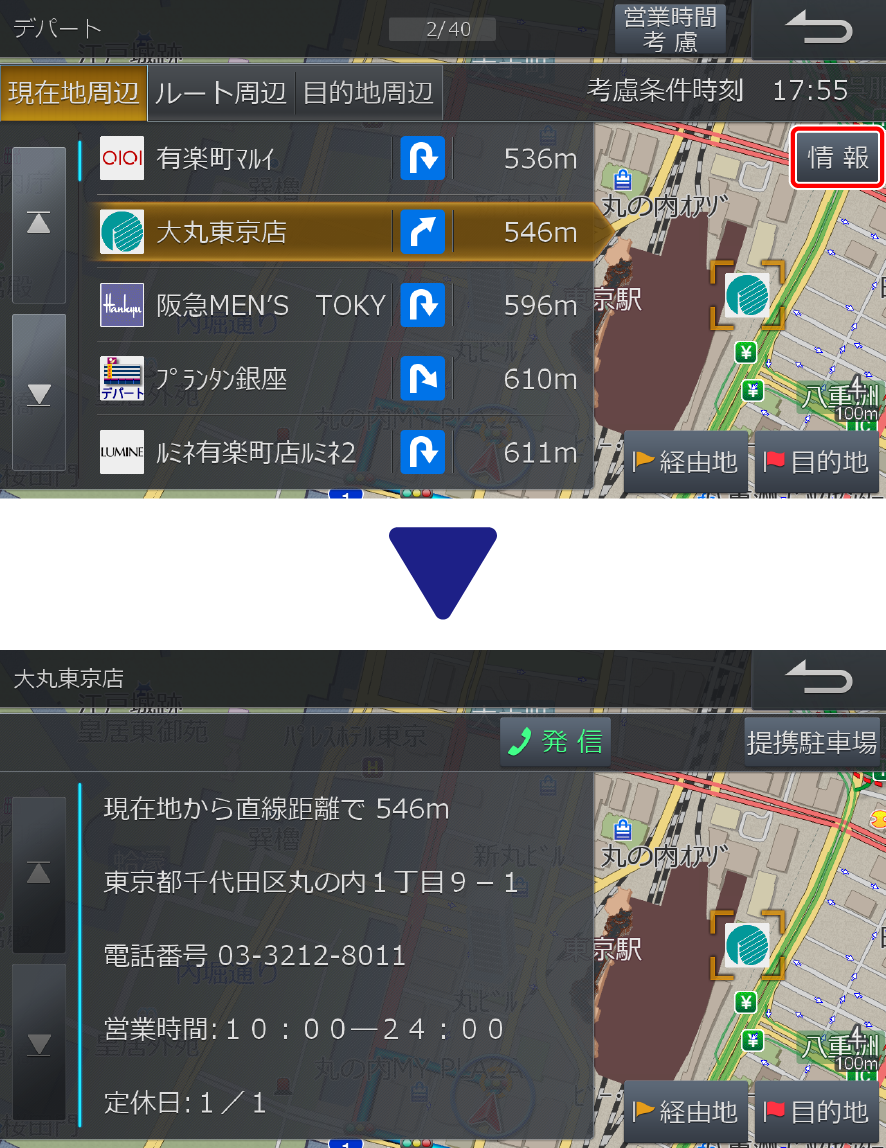 選んだ施設を経由地に設定します。目的地が設定されている場合のみ操作できます。