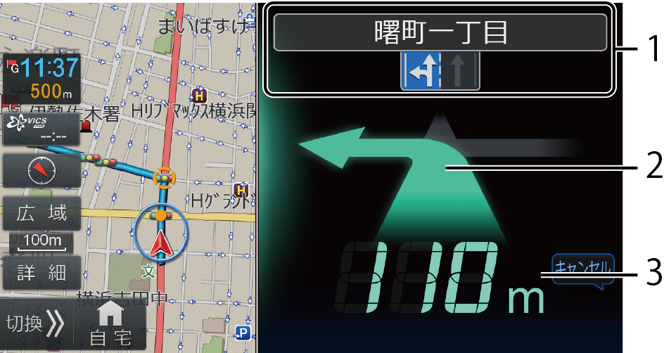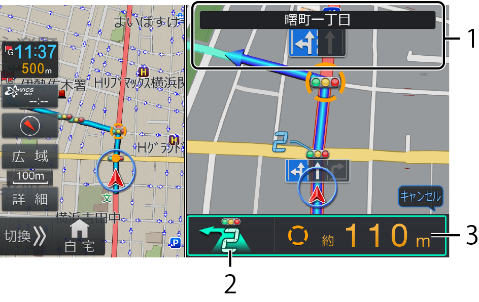 交差点拡大図を解除するにはボイスタッチワード「キャンセル」と発話するか拡大図表示部分にタッチします。解除した交差点拡大図を再表示するには[現在地]スイッチを押します。