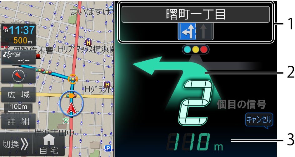 ・音声案内設定が信号・交差点案内設定時には、地図データ収録の信号機データを元に残信号・交差点数を表示・案内します。ただし実際の道路状況と異なる場合や距離で表示・案内する場合があります。信号機データ収録地域については、アルパインホームページを参照してください。