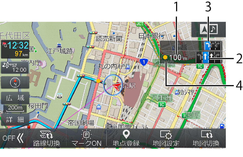が表示されます。右左折する場合は交差点拡大図が表示されるタイミングで