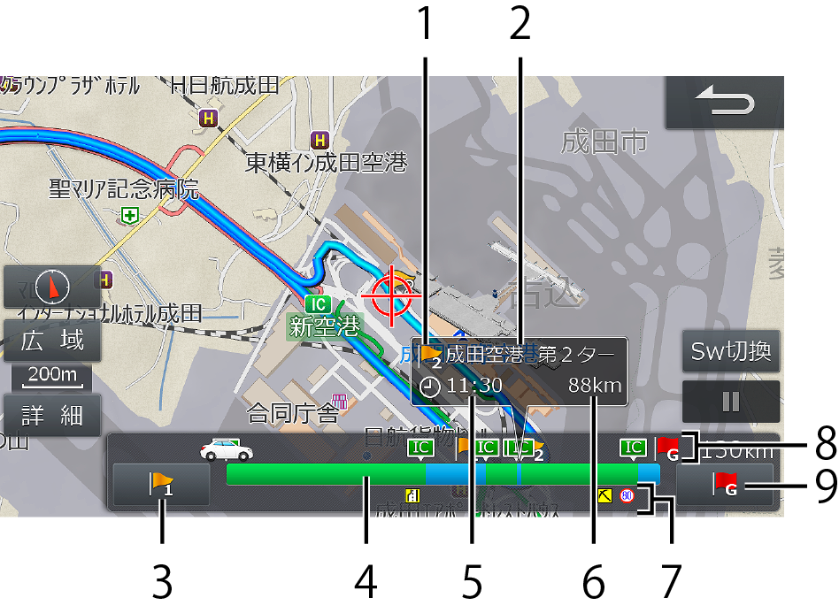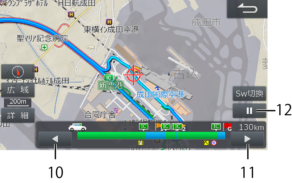 [Sw切換]にタッチするとスクロール方法が変わります。案内地点スキップスイッチにタッチすると、その地点の地図にスキップします。