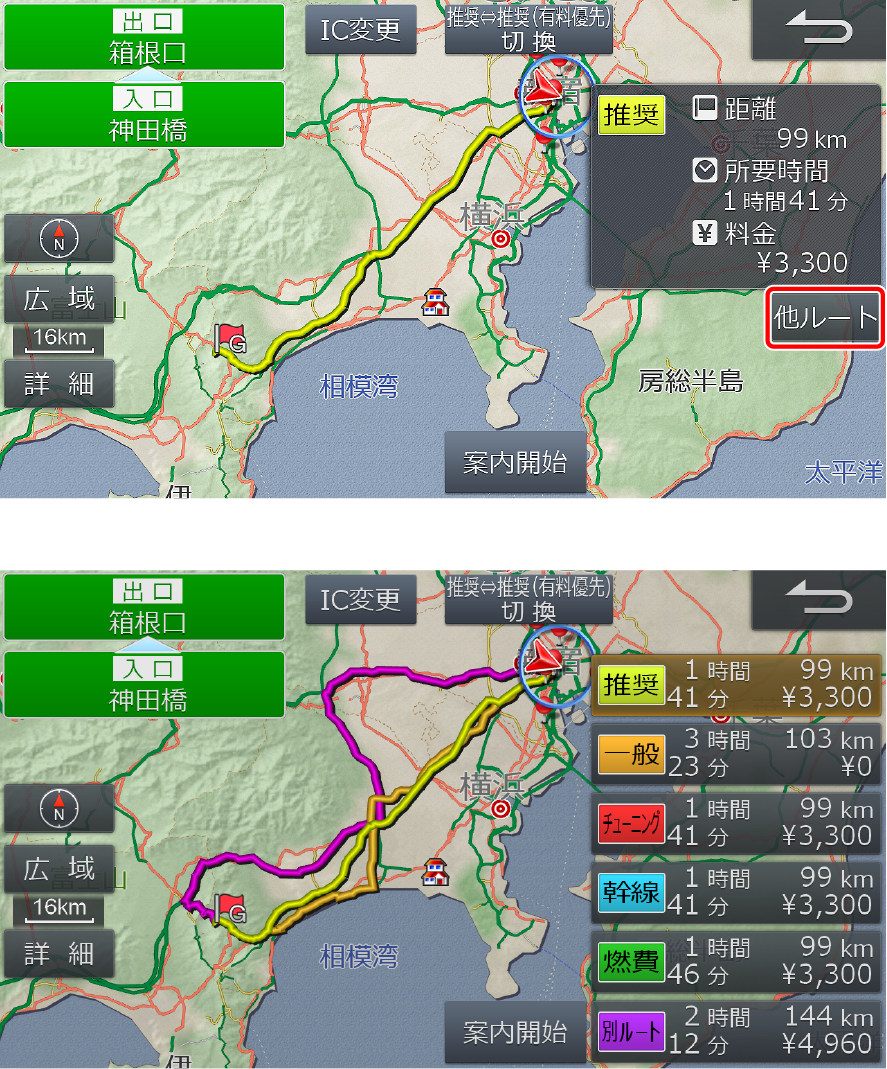 探索結果画面で[他ルート]にタッチするとすべてのルートを確認できます。