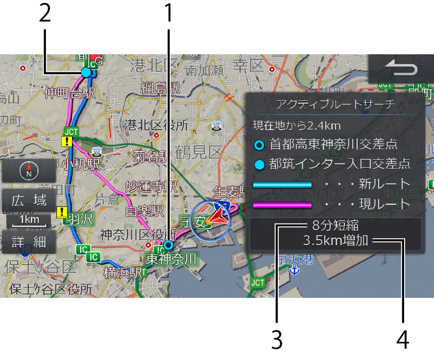 時間短縮ルートが見つかった場合は、 新ルートと 現ルートを同時に表示したアクティブルートサーチ画面が表示されます。