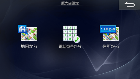 [地図から][電話番号から][住所から]のいずれかにタッチして販売店を検索し、[登録]にタッチします。設定が完了したら[次へ→]にタッチします。