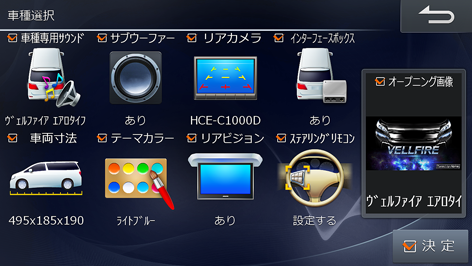 メーカー名を選択して[決定]にタッチし、続けて車種名とグレードを選択して[決定]にタッチします。