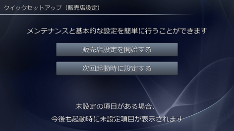 販売店設定は本機取り付け時に販売店で行いますので、通常は操作の必要はありません。クイックセットアップが初期化された場合や再設定が必要な場合は、本設定を行ってください。クイックセットアップ初期化後の初回起動時に設定画面が表示されます。
