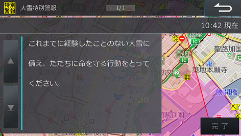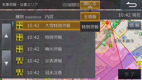 リストは特別警報アイコンが表示されたVICSタイムスタンプにタッチして表示することもできます。
