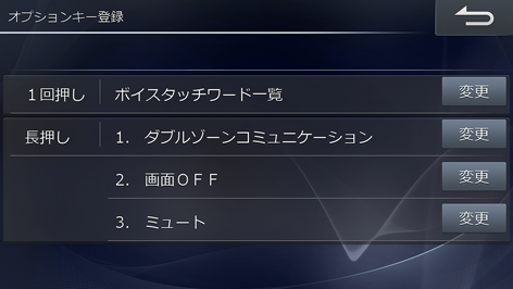 オプションキーに機能を割り当てます。1回押しに1つ、長押しに3つの合計4つの機能を登録することができます(初期設定値は1回押し:「ボイスタッチワード一覧」、長押し「1.ダブルゾーンコミュニケーション」「2.画面OFF」「3.ミュート」)。