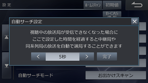 一定時間放送局を受信できないときに、中継局や同系列局の放送局を自動で選局するまでのおおよその時間を5秒刻みで設定できます(初期設定値は「5秒」)。