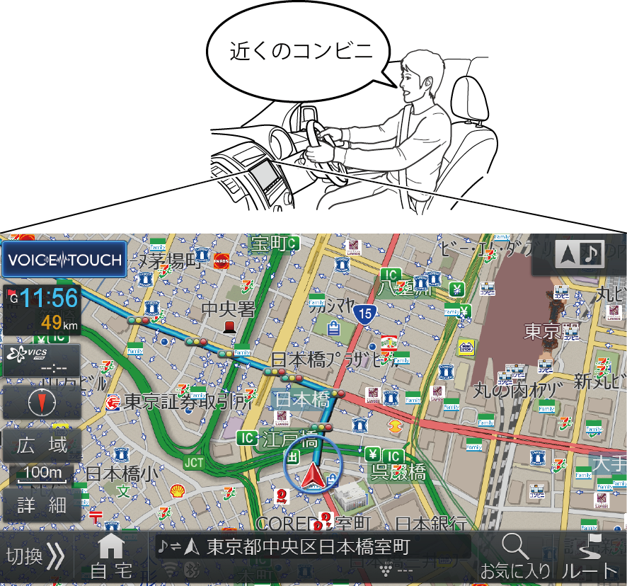 よく使う機能を発話するだけで、スイッチ操作や画面タッチなしで操作できるボイスタッチ機能を使用することができます。ボイスタッチ機能は、現在地画面またはオーディオ再生画面でボイスタッチワード一覧のワードを発話することで、施設検索やカメラの映像を表示することができます。