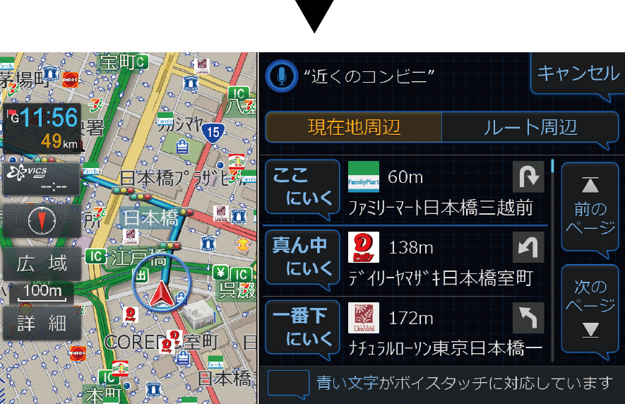 ボイスタッチ用操作画面は、画面をタッチするタッチ操作でも操作することができます。ただし走行中は安全のため検索リスト画面のタッチ操作はできません。