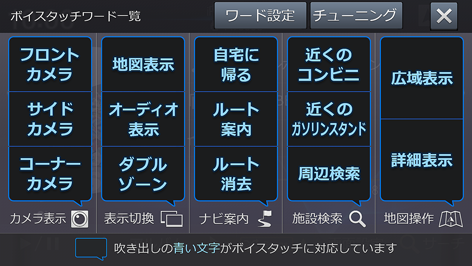 (オプションキー)を押すとボイスタッチワード一覧を見ることができます。オプションキー1回押しの初期設定値に「ボイスタッチワード一覧」が登録されています。ステアリングリモコンに機能を割り当てることもできます。