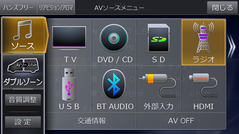 AUDIO/[MODE]スイッチを押し、AVソースメニュー画面で[ラジオ]にタッチします。