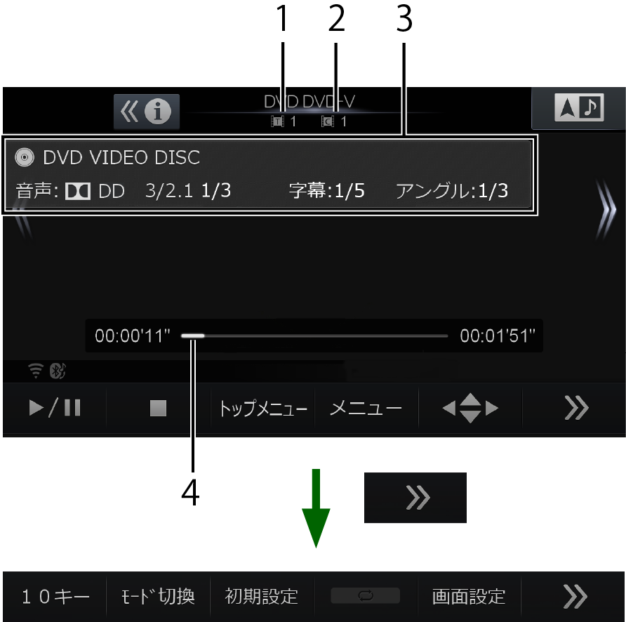 再生中にエンジンをOFFにする、AVソースを切りかえるなどの操作をしても、次に電源をONにしてDVDモードにすると続きから再生します(プレイポジションメモリ)。ディスクを取り出すとプレイポジションメモリは解除されます。