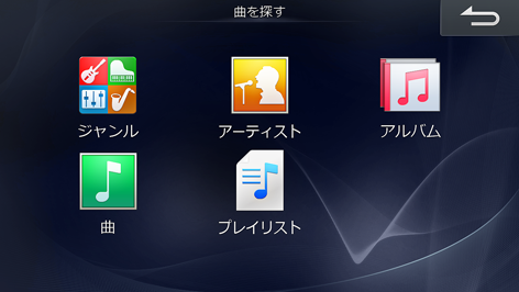 ジャンルやアーティストなど、5つのサーチモードからそれぞれのリスト表示を行い、選択できます。