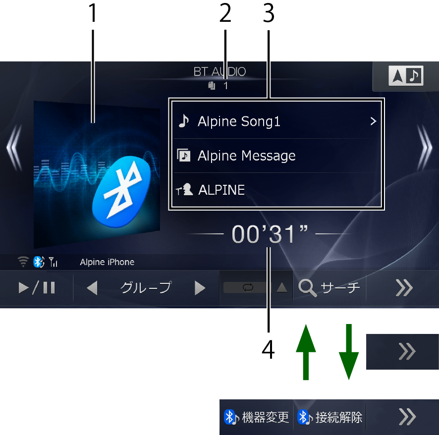お使いの携帯電話のAVRCP(BLUETOOTH接続して音楽再生するためのプロファイル)のバージョンによって、再生画面に表示される内容や操作が異なります。下記画面は、AVRCPバージョン1.4に対応したBLUETOOTH AUDIO機器を接続したときの表示例です。