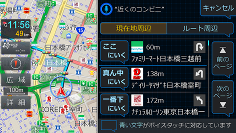 現在地画面またはオーディオ画面で[近くのコンビニ]と発話すると、現在地周辺のリストを3件表示します。