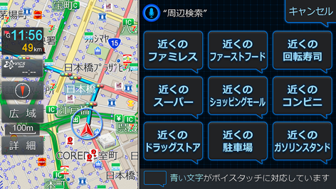 現在地周辺の施設を検索し目的地に設定することができます。ここでは近くのファミレスを目的地に設定する方法を例に説明します。