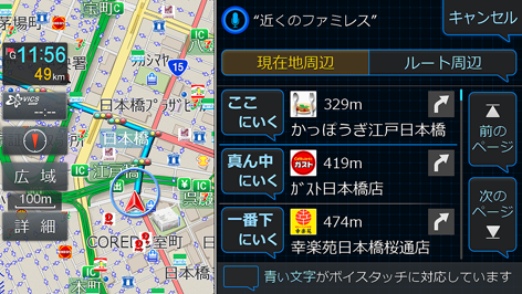 「近くのファミレス」と発話すると、現在地周辺のリストを3件表示します。