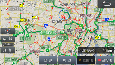 規制マークは縮尺1km以下の地図で表示させることができます。ただし、通行止め、入り口閉鎖、オフランプ(出口)閉鎖は、関連する事象も含めて20kmスケール以下の道路が表示されるスケールの地図まで表示します。