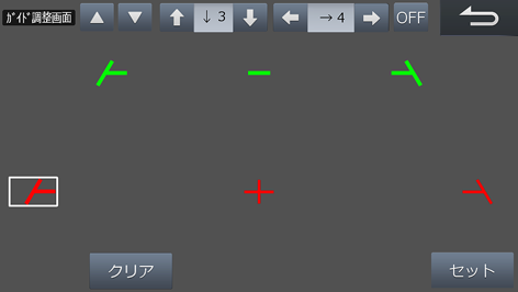 [↑][↓][←][→]にタッチしてガイドの位置を調整します。[OFF]または[ON]にタッチすると、選択したガイドを非表示・表示します。調整が済んだら[セット]にタッチします。