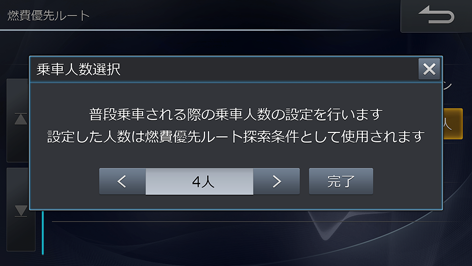 普段乗車する人数の設定を行います。設定された人数は燃費優先ルート探索条件として使用されます(初期設定値は「4人」)。