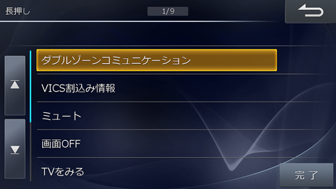 設定値:ダブルゾーンコミュニケーション/VICS割込み情報/ミュート/画面OFF/サイドカメラ/コーナーカメラ/ルームカメラ/フロントカメラ/インターフェースボックスAUX IN/エネルギーモニター/TVをみる/自宅に帰る(地図画面のみ操作可能)/後席個別ON/OFF/ダブルゾーンメニュー/ボイスタッチワード一覧