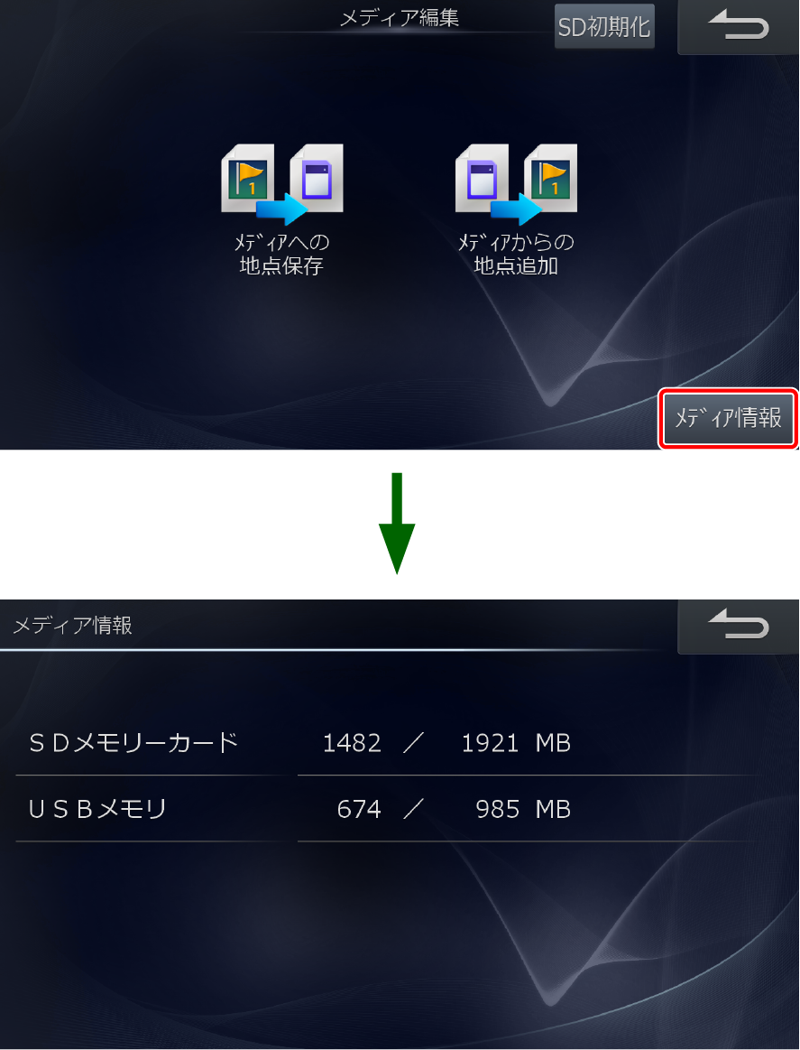 [メディア情報]にタッチすると、各メディアの最大容量と空き容量が表示されます。