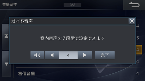 ナビゲーション案内音声の音量を調整します。音声をOFF にすることもできます(初期設定値は「4」)。