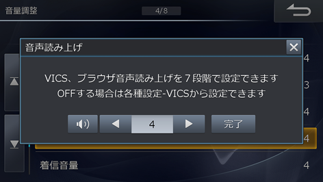 VICS・ブラウザ音声読み上げの音量を調整します(初期設定値は「4」)。
