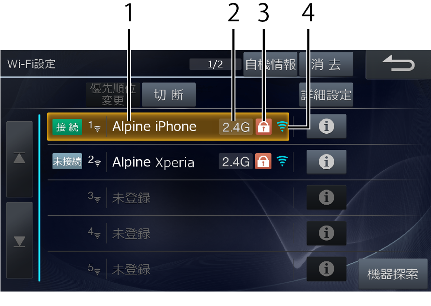 登録したWi-Fi通信機器を消去できます。リスト画面で消したい機器を選んで[消去]にタッチします。確認画面が表示されたら[はい]にタッチします。