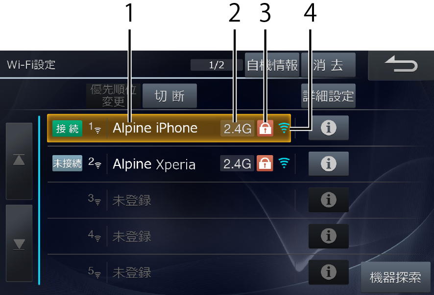 本機はWi-Fi通信機器を10台まで登録しておくことができます。10台を超えると古い機器から削除されます。また、実際に接続できるのはその中の1台になり、2台以上同時に接続することはできません。