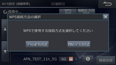 プッシュボタン方式を選択した場合、2分以内にWi-Fi通信機器側でボタンを押して登録操作を行ってください。PINコード入力方式を選択した場合、2分以内に本機画面に表示されたPINコードをWi-Fi通信機器に入力してください。