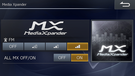 MX(Media Xpander)は、FMやCDなどメディアごとにボーカルや各楽器の音を際立たせ、走行騒音の多い車内においても音楽をクリアに再生することができます(初期設定値は「OFF」)。
