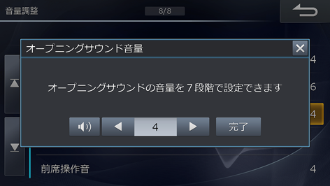 車種専用チューニングで選択したオープニングサウンド適応車種のみ、音量設定をすることができます。