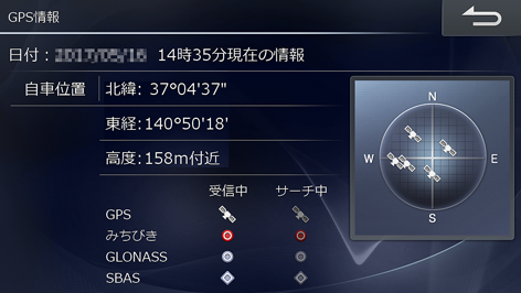 [車両情報]タブにタッチし、[GPS情報]にタッチします。GPS情報画面が表示され、衛星(GPS・みちびきなど)の受信情報を表示します。