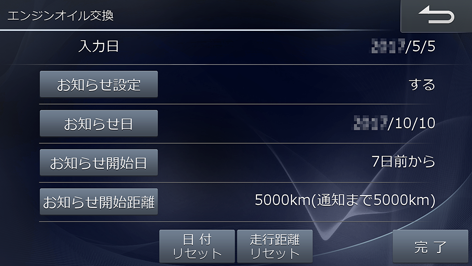 入力したお知らせ日、走行した距離(お知らせまでの残距離)をリセットします。