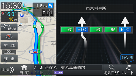 ETC 車載器またはETC2.0車載器にETCカードを挿入している場合は、ルート走行中、料金所に近づくとETCレーン案内を行います。ETCアンテナから情報を受信すると、利用料金を表示します。