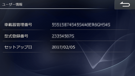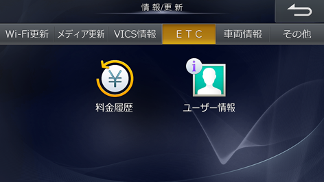 [ETC]タブにタッチし、[ユーザー情報]にタッチします。車載器管理番号などのユーザー情報が表示されます。