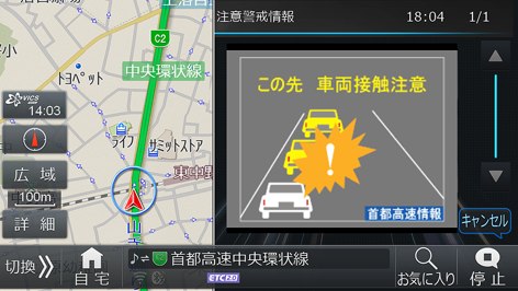 走行ルート上に渋滞や落下物などがある場合、簡易図形と音声で注意喚起を行います。