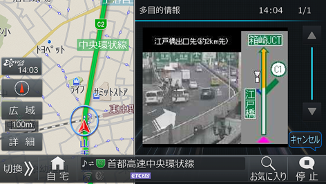 本機では別売のETC2.0車載器(HCE-B110V/HCE-B110)を接続することにより、道路交通情報や安全運転支援情報を音声や画像で案内したり、渋滞・規制情報を考慮したルート探索ができます。