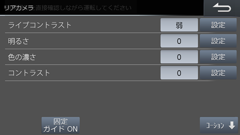 リアカメラ、フロントカメラ、サイドカメラ、コーナーカメラのガイド表示をON/OFFできます。リアカメラガイド線は、固定ガイド線、ステアリング連動ガイド線それぞれをON/OFFできます。