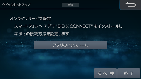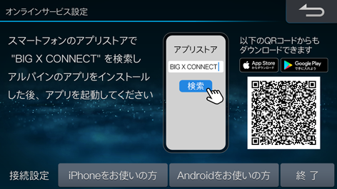 オリジナルスマートフォンアプリ「BIG X CONNECT」と連携して本機の地図データ更新などを行うためにオンラインサービスを設定します。[アプリのインストール]にタッチし、QRコードを読み込んだリンク先でアプリをインストールします。