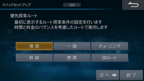 「優先探索ルート」を[推奨][一般][チューニング][幹線][燃費][別ルート]のいずれかにタッチして選び、[次へ→]にタッチします。