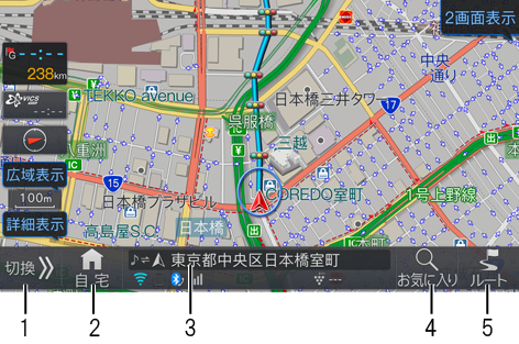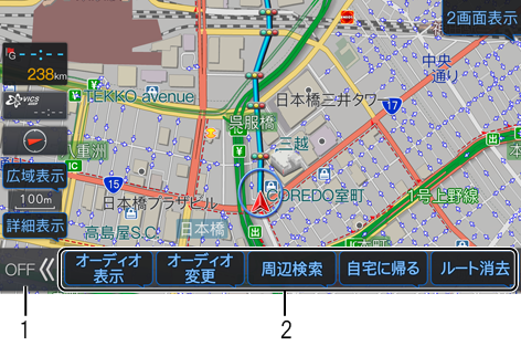地図画面下部の操作スイッチは、切換スイッチにタッチするたびに操作スイッチ内容も変わります。操作スイッチ表示をOFFにすることもできます。